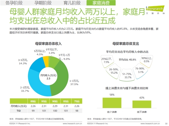 报告指出,母婴亲子人群的消费模式正在经历显著转变。家庭平均月收入达到2.3万元,而月支出占收入的45.8%,显示出家庭经济状况整体健康。值得注意的是,家庭支出中线上消费占据了主导地位,占比高达58%。