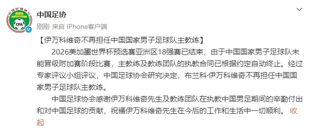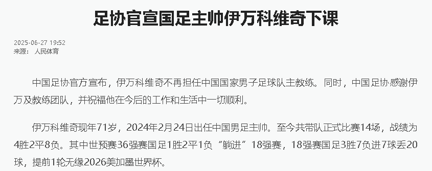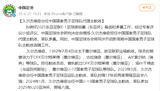 中国足球协会今日(2025年6月27日)发布两则重要人事变动公告,中国国家男子足球队主教练职位发生变化。伊万科维奇不再担任中国国家男子足球队主教练,久尔杰维奇出任代理主帅。