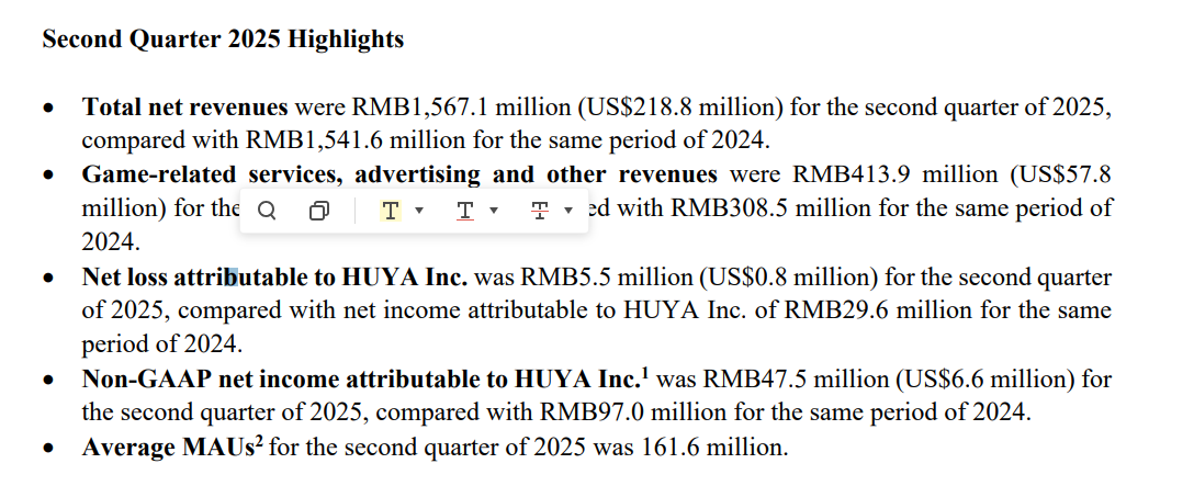 从数据来看,如此低的收入增速尚不足以确认虎牙收入实现反转,还需要对其收入数据进行持续跟踪观察。利润方面,2025年第二季度,公司净利润为-549万元,而上年同期为2960万元;非美国通用会计准则下虎牙净利润为4754万元,同样低于上年同期的9700万元。