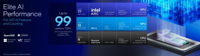 值得一提的是,该系列处理器提供针对NPU+的支持,CPU+GPU+NPU全平台算力高达99 TOPS,不仅大幅提升生产力,还能部署DeepSeek 14b环境,为本地大模型试炼提供强大助力。
