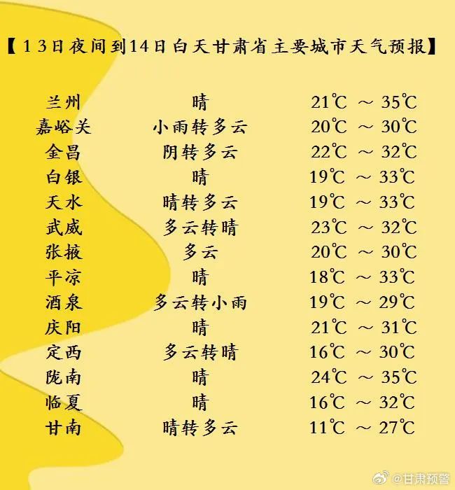 今天夜间到明天白天(7月13日20时-7月14日20时),河西五市阴转多云,部分地方有阵雨或雷阵雨;甘南、陇南两州市及定西市南部晴间阴,局部地方有阵雨或雷阵雨;省内其余地方晴或多云。